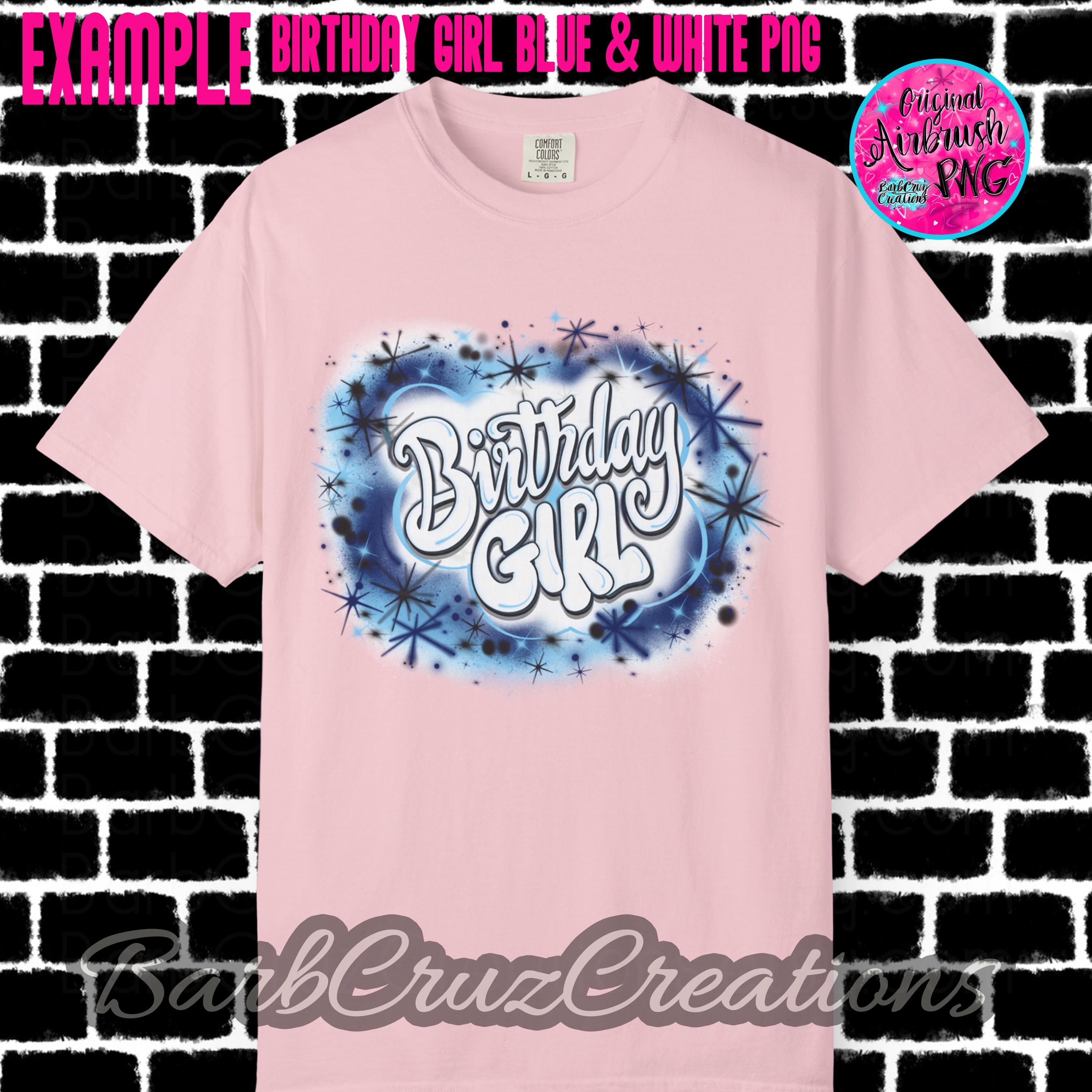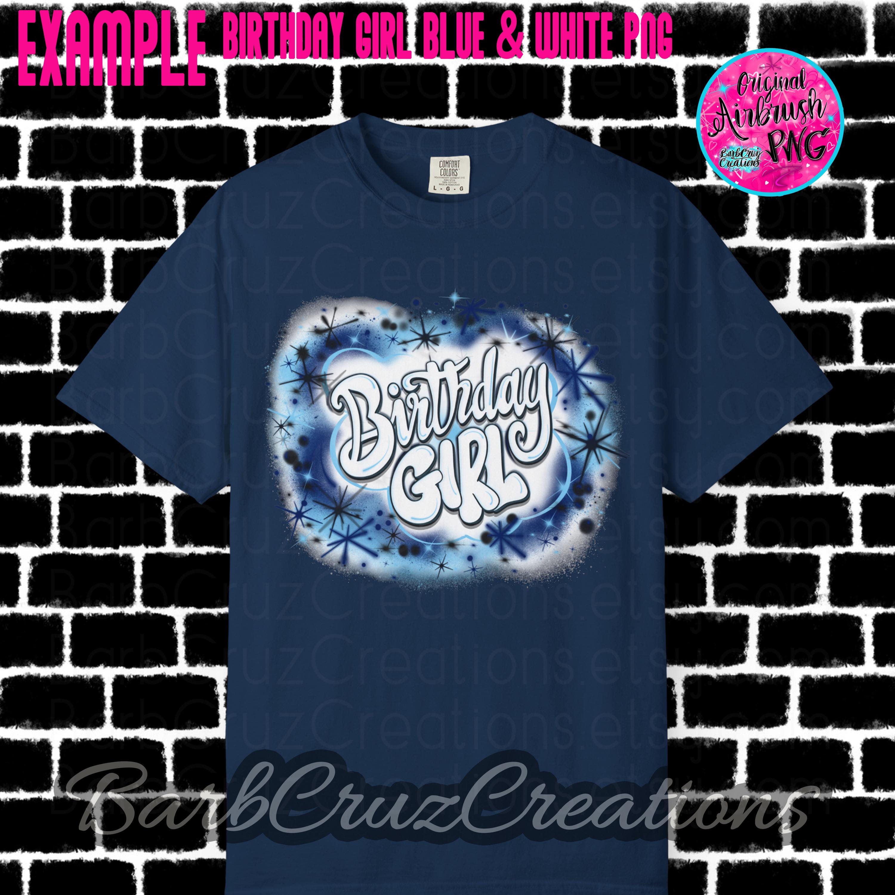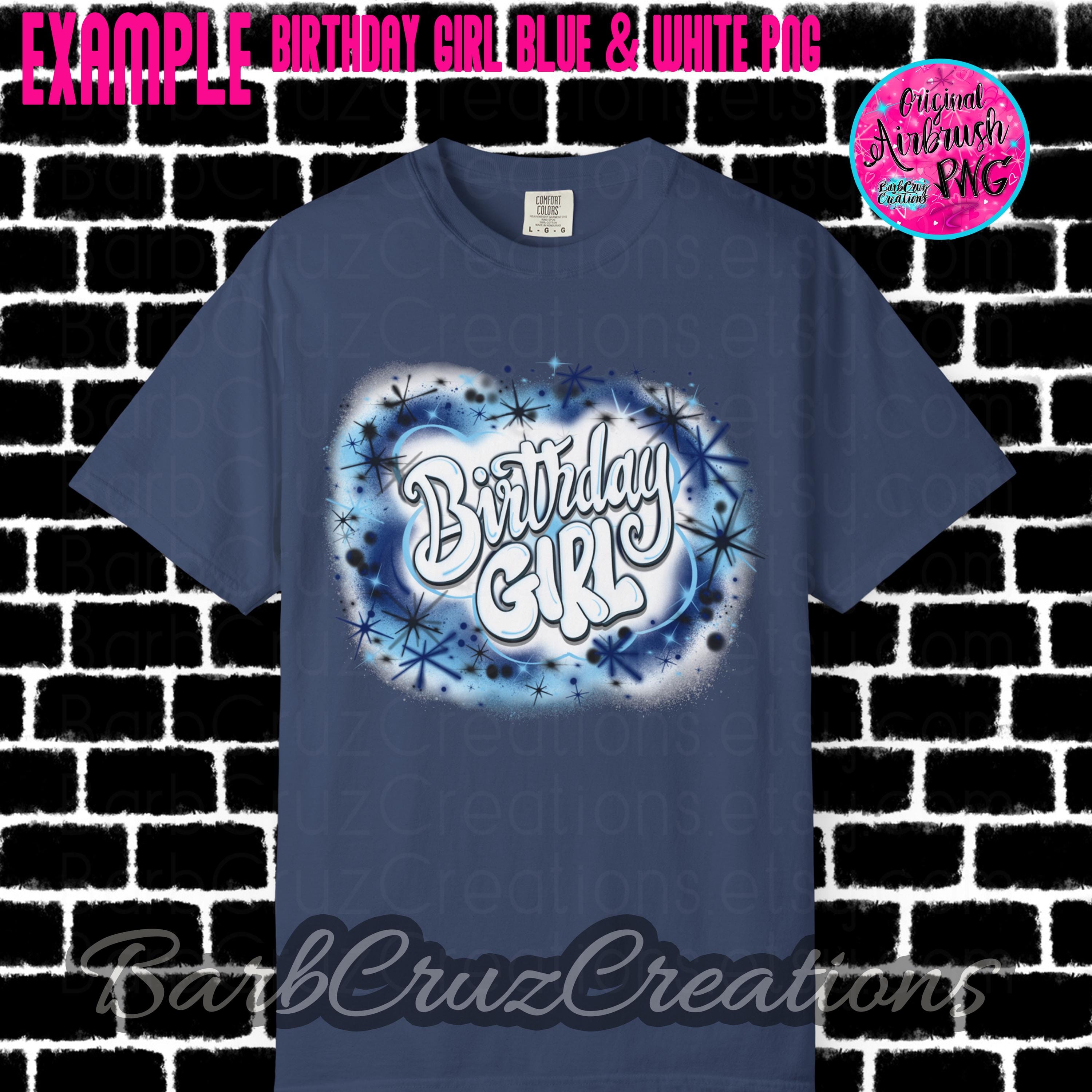 Airbrush png, Birthday Girl White, Blue, DTF, White Printing, Party Shirt, Birthday Gift, png, Dark Shirt, Party, Celebration Tee's
