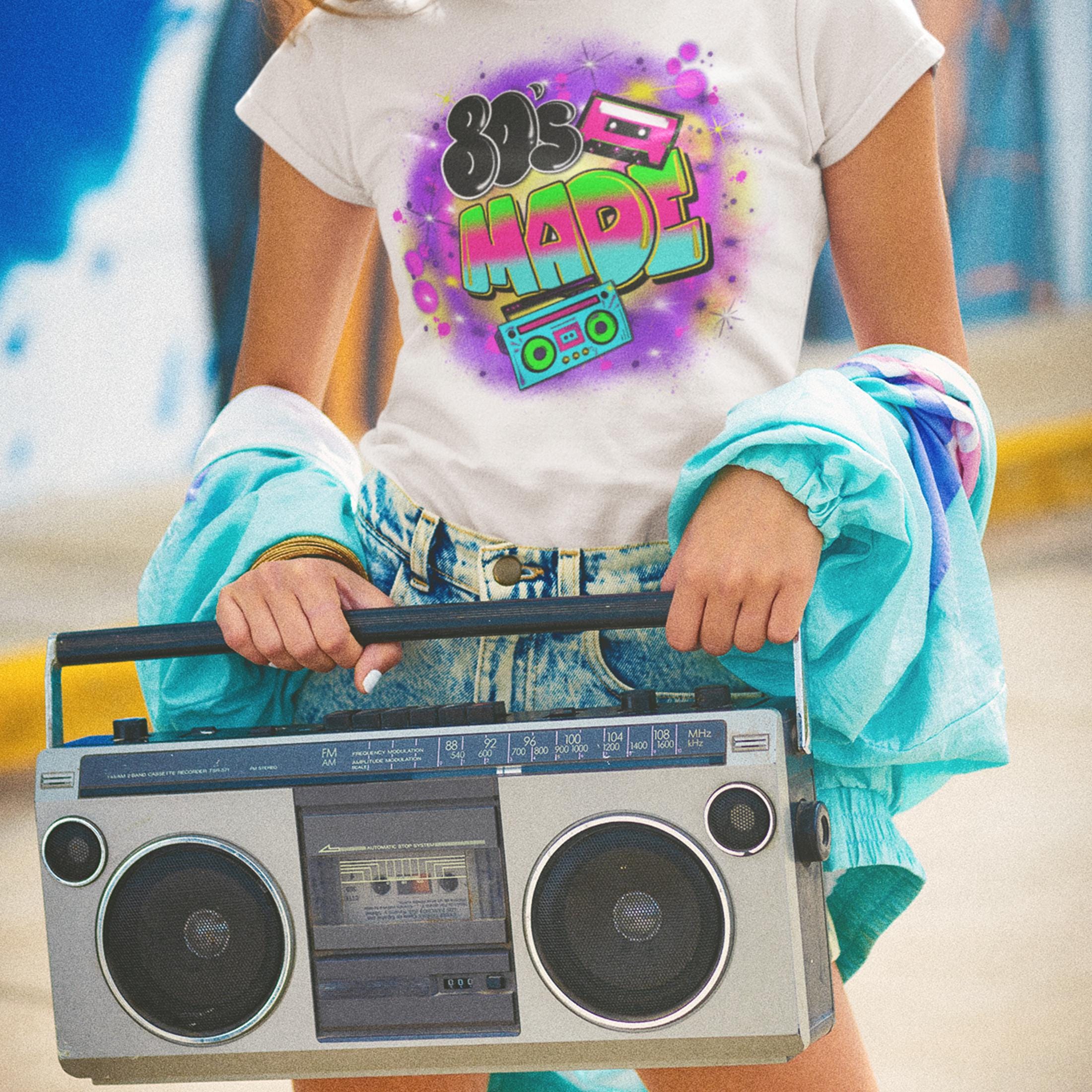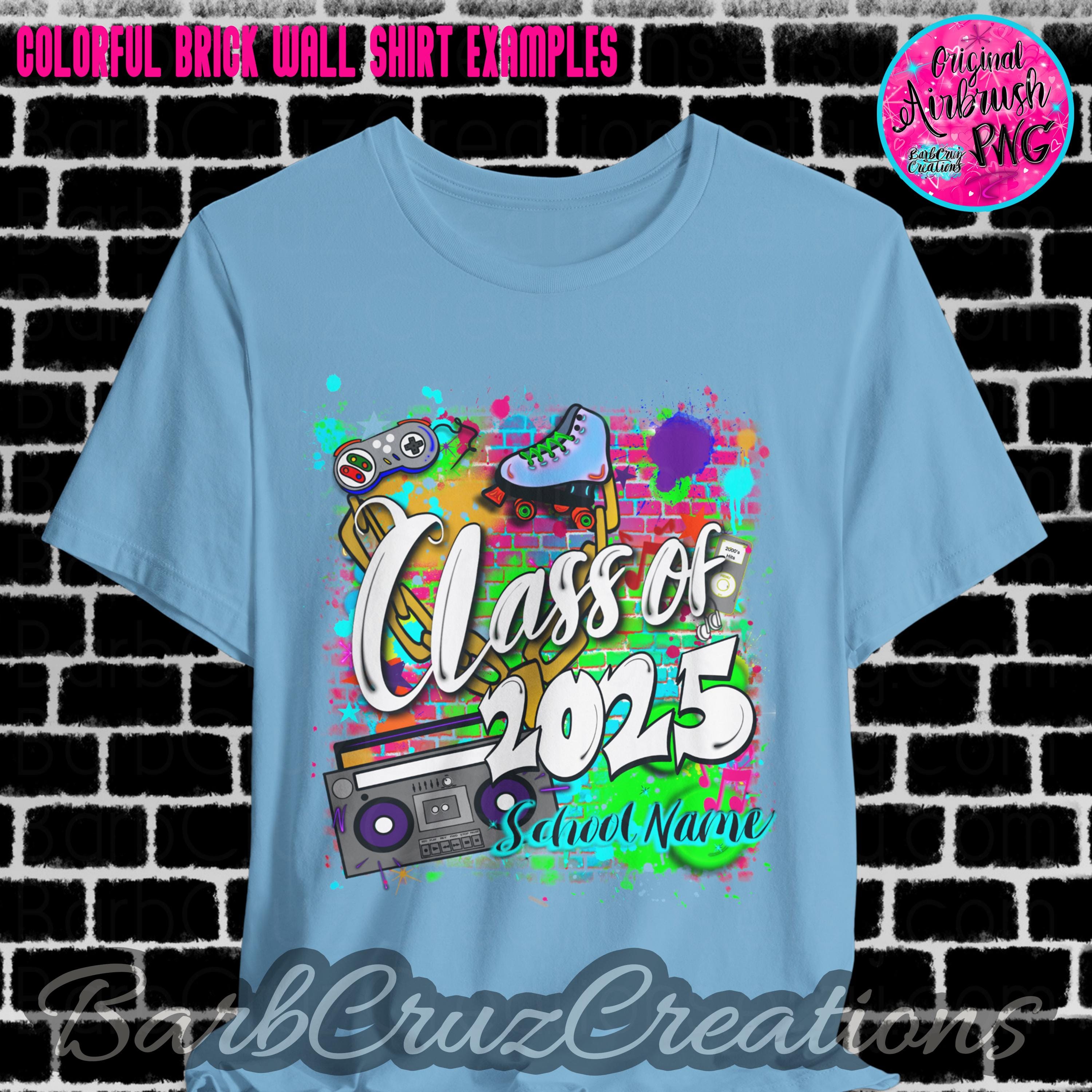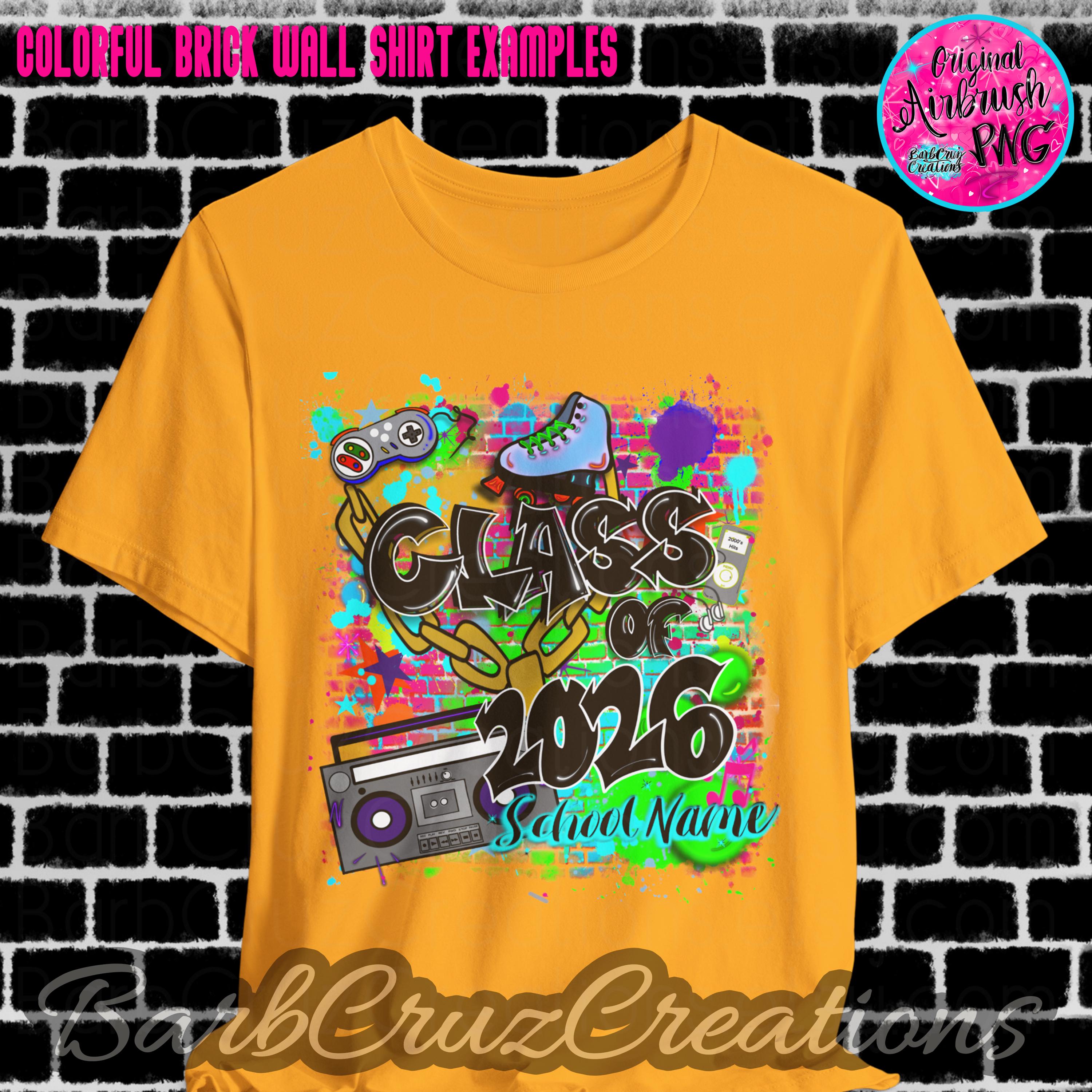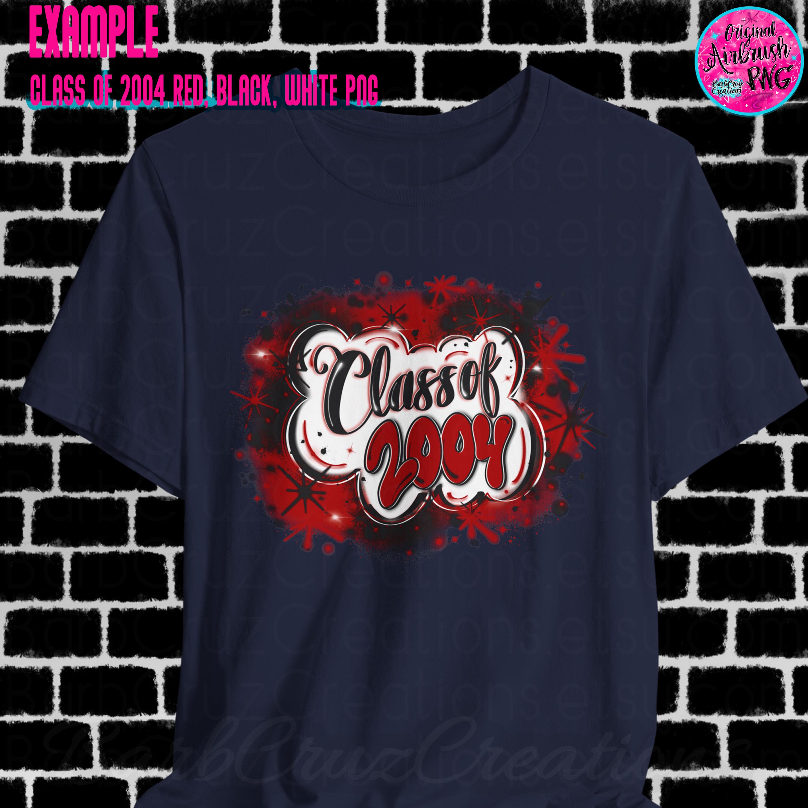 These are a fun old school throw back to the 90's / 2000's and come in bright colors on a white t-shirt. OR the design you sent in our messages.