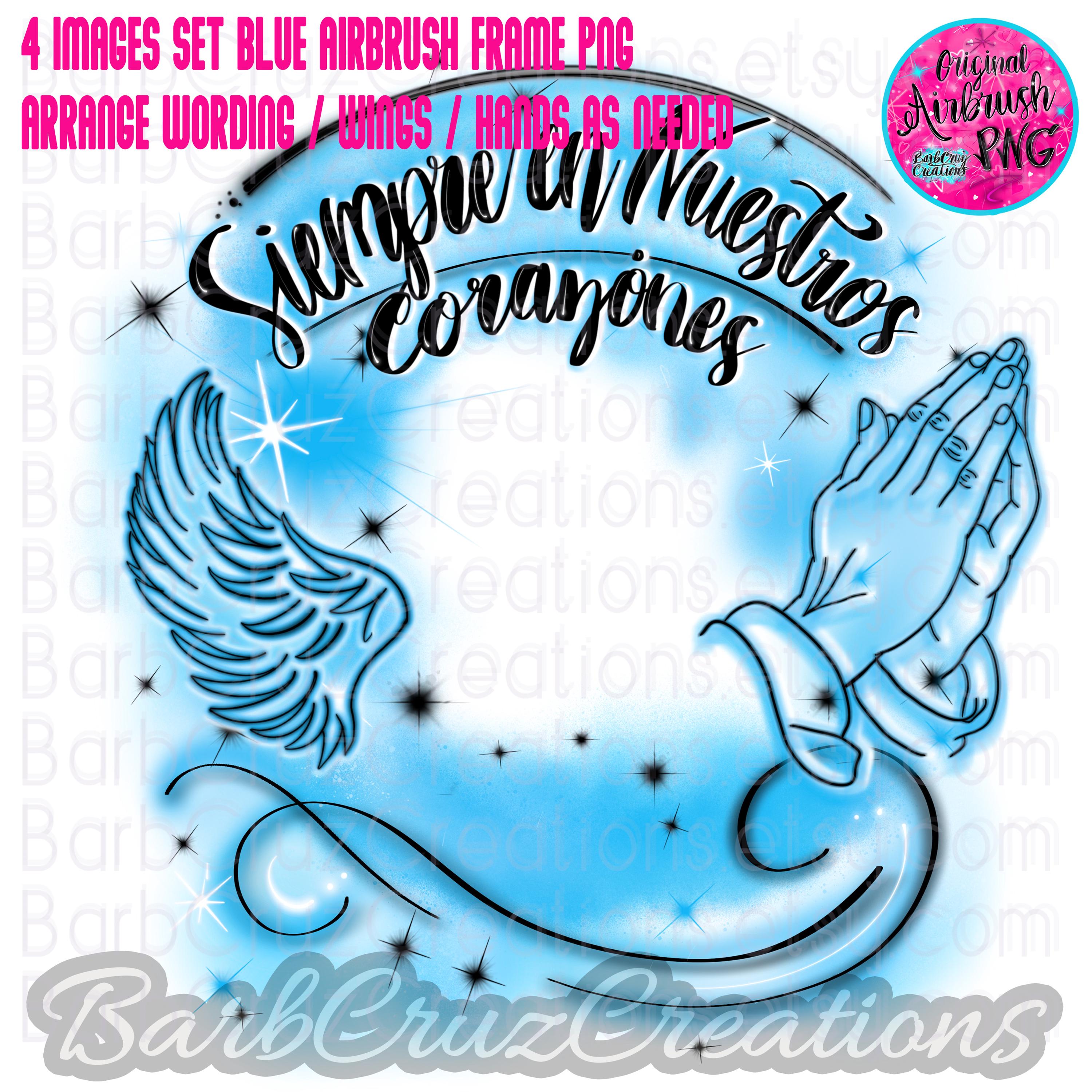 Airbrushed Blue Digital frame, Siempre en Nuestros Corazones wording, praying hands, and wing 4 piece set each a png file - NOT the examples shown