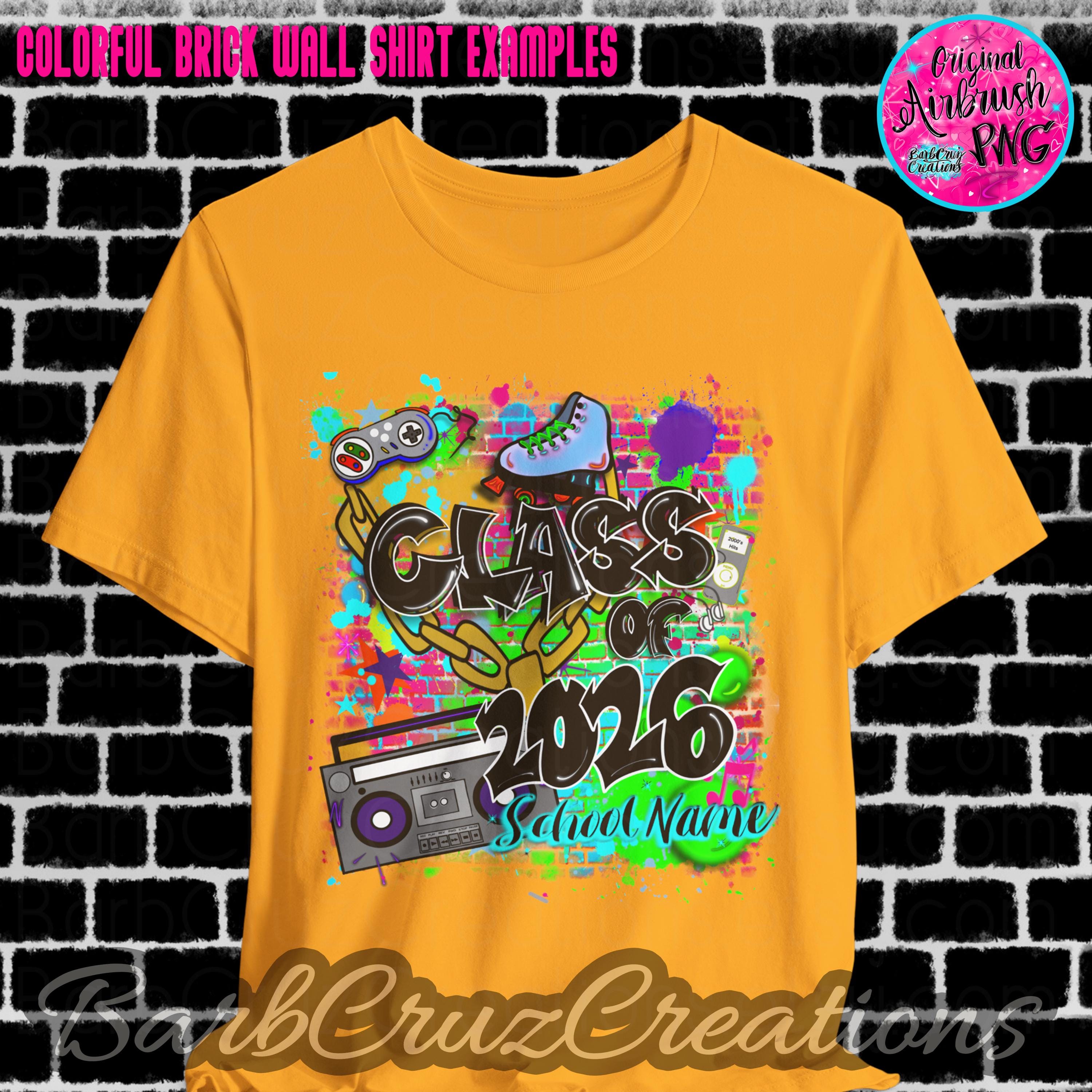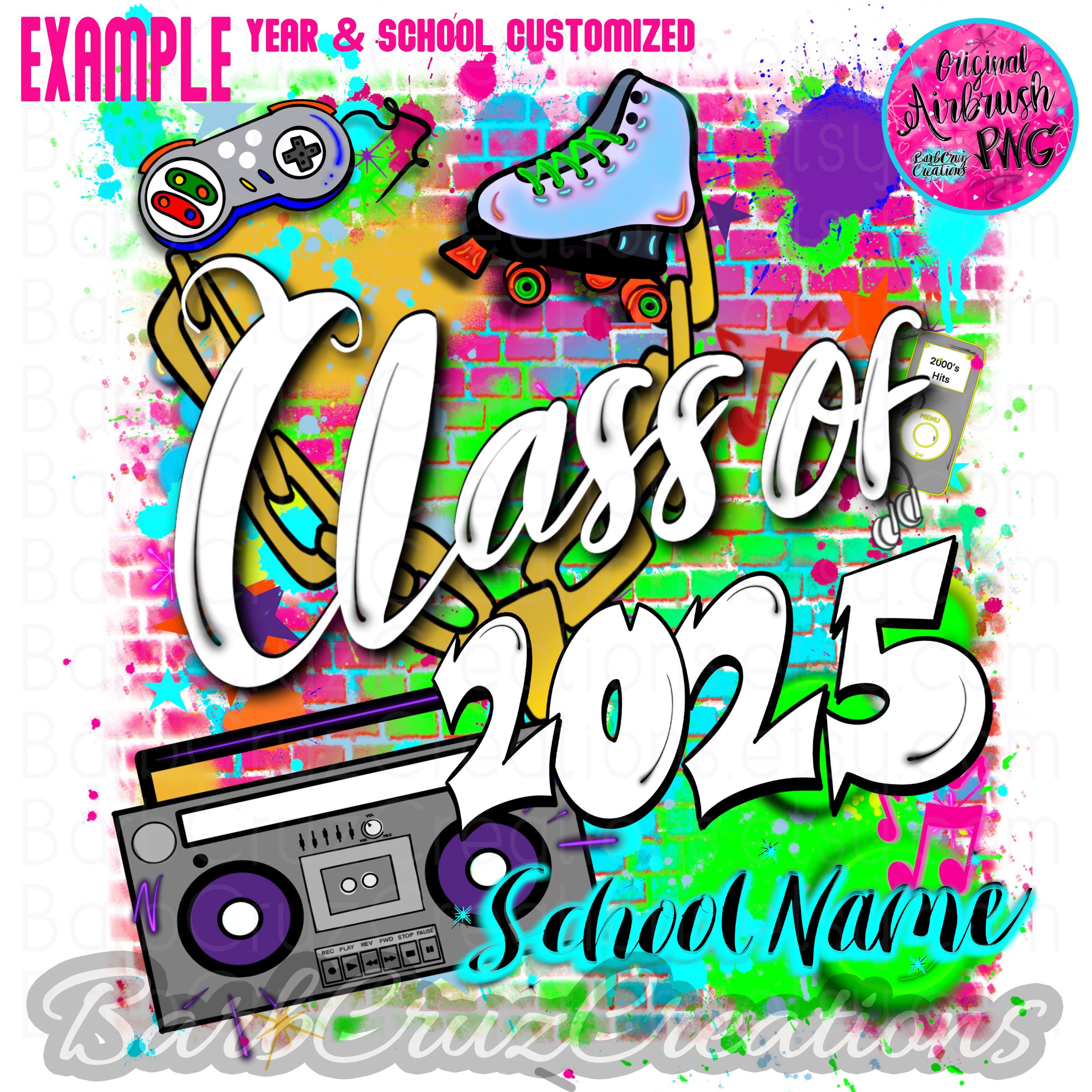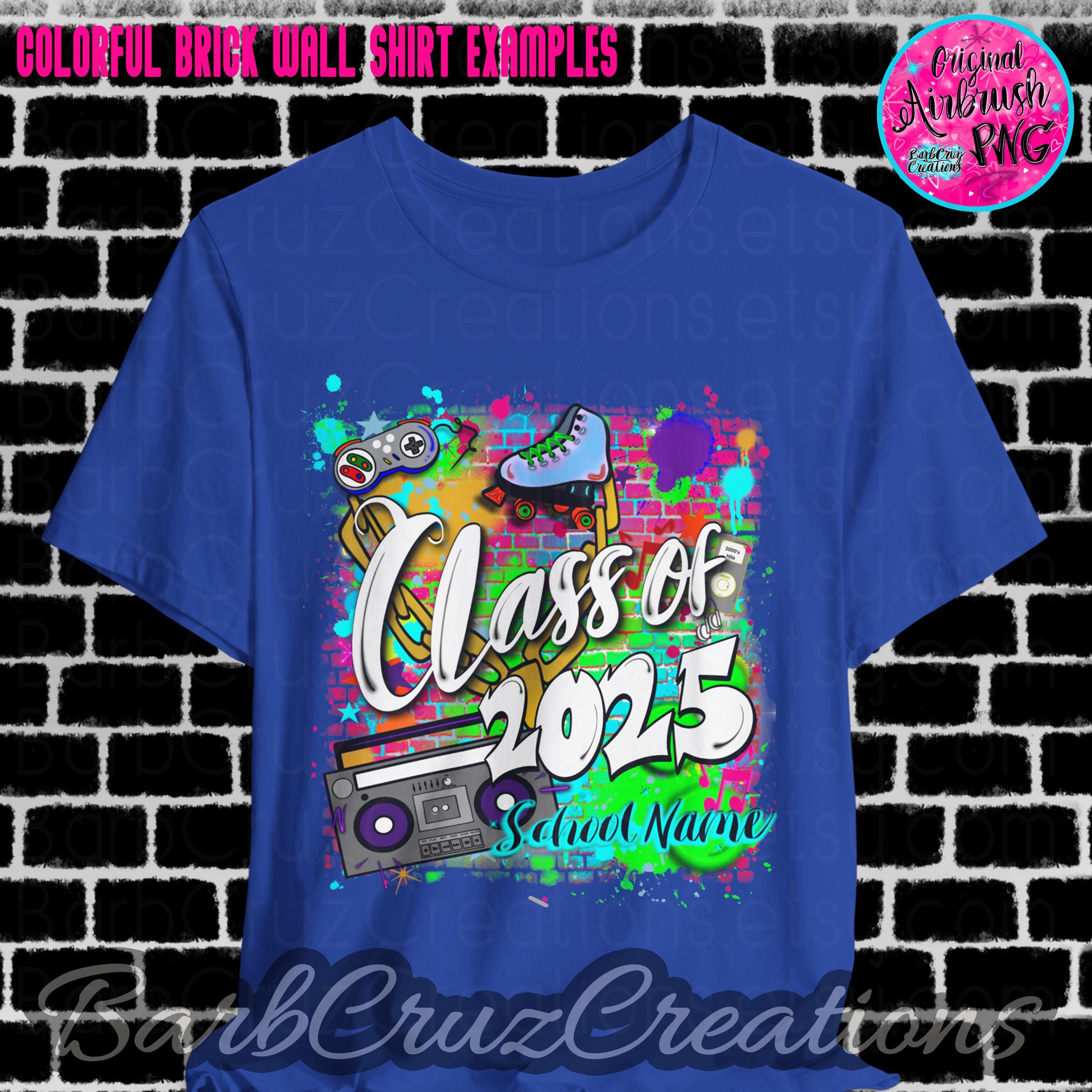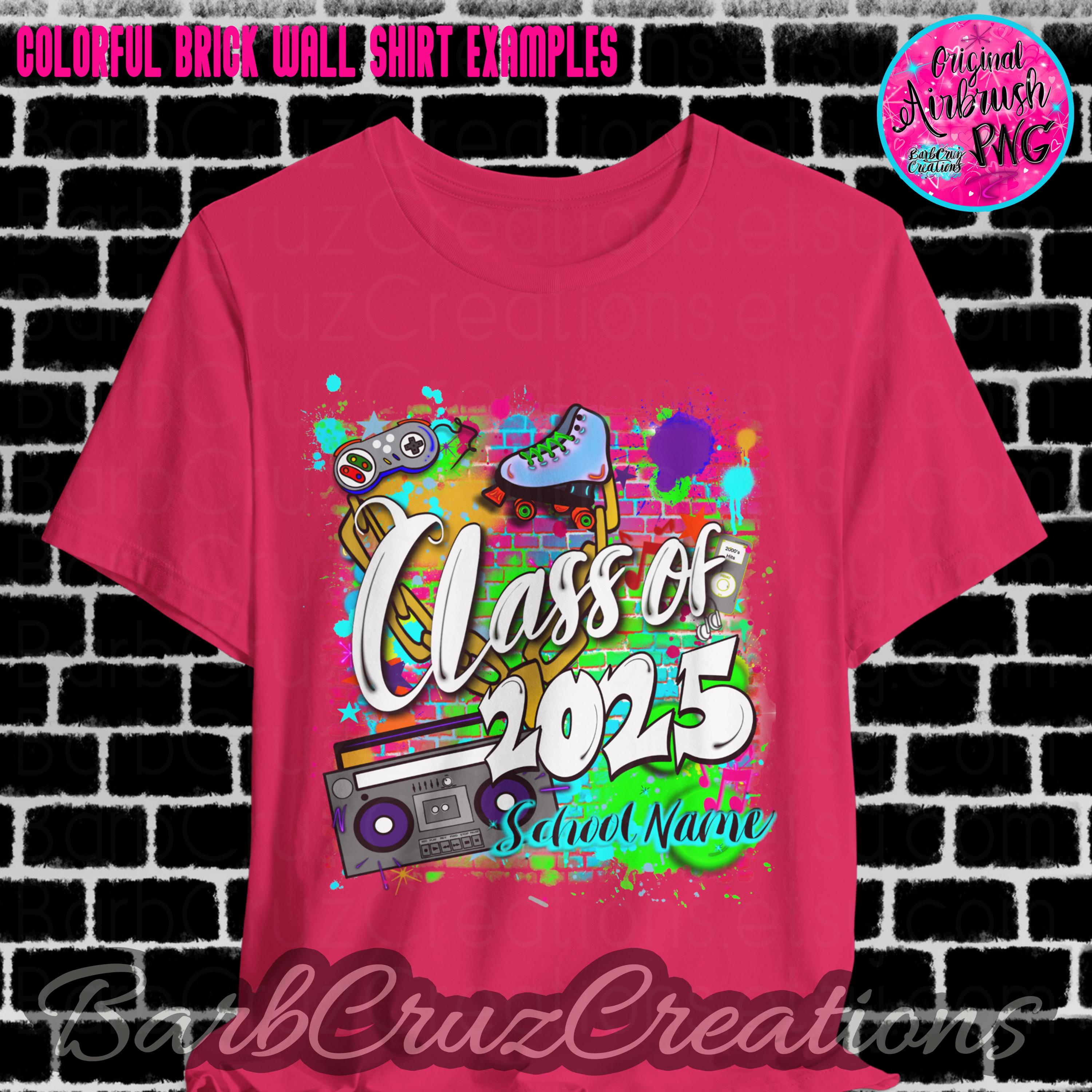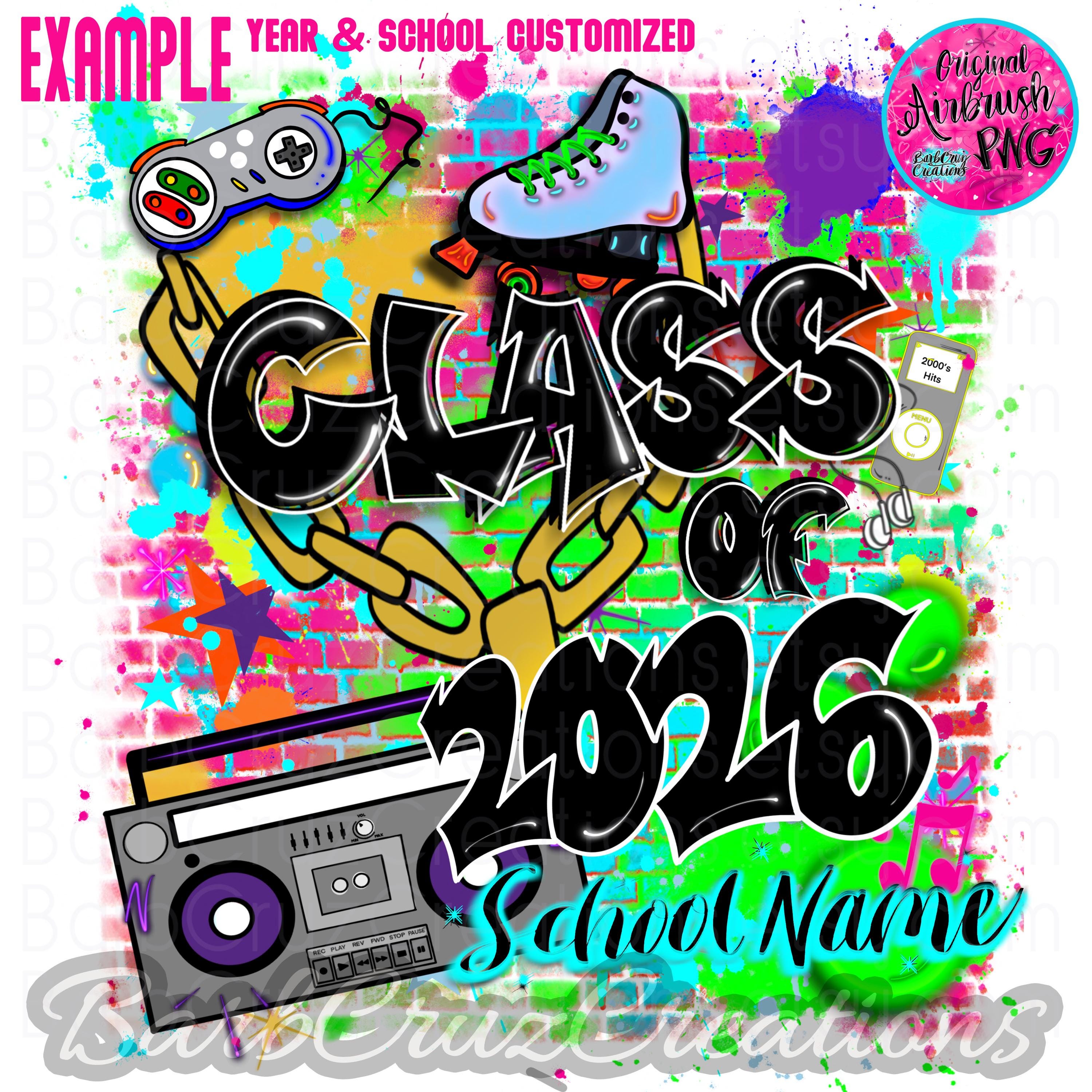 This purchase is for a colorful 90's/2000's airbrushed brick wall design with your choice of black or white wording, your school name OR student name, and the graduating year added.