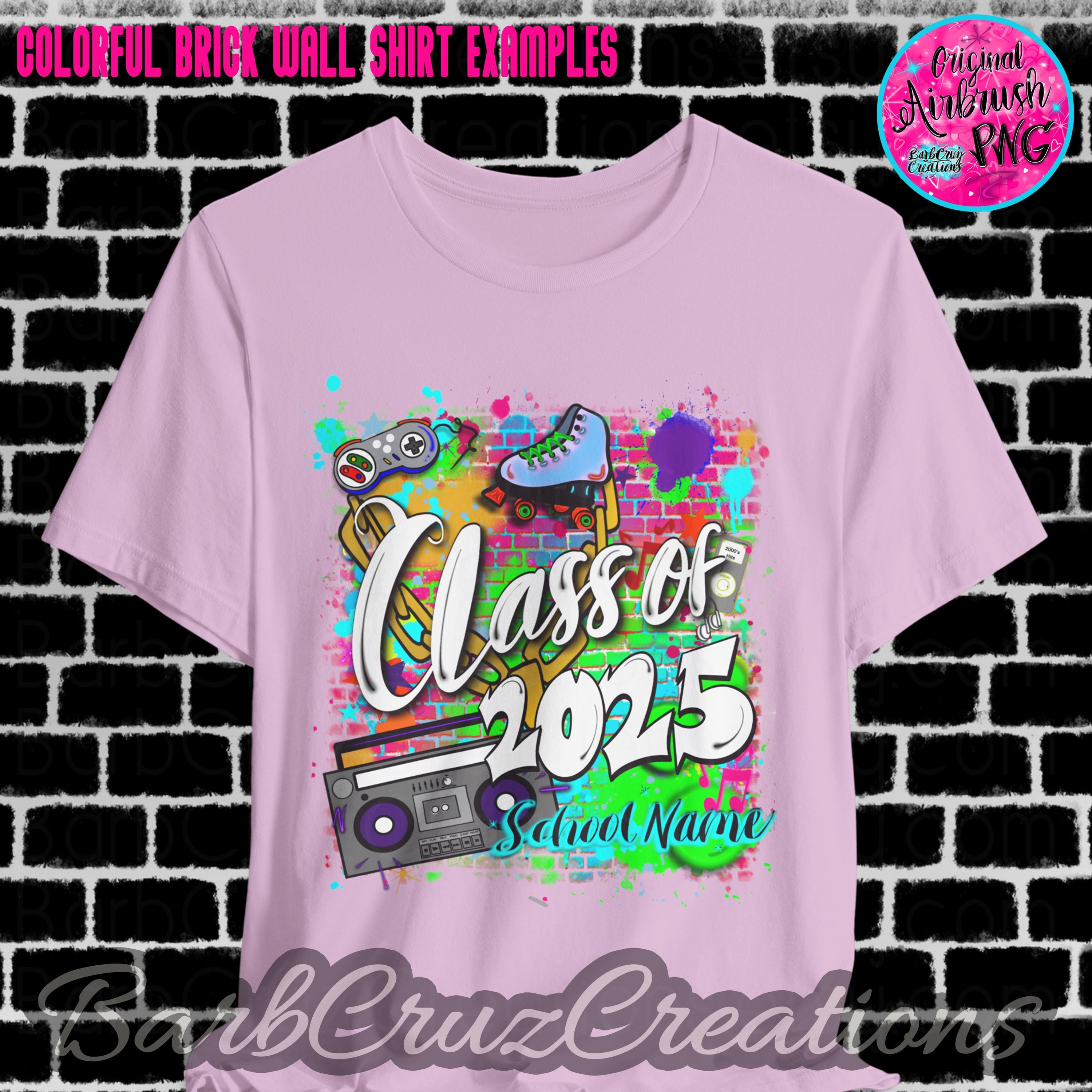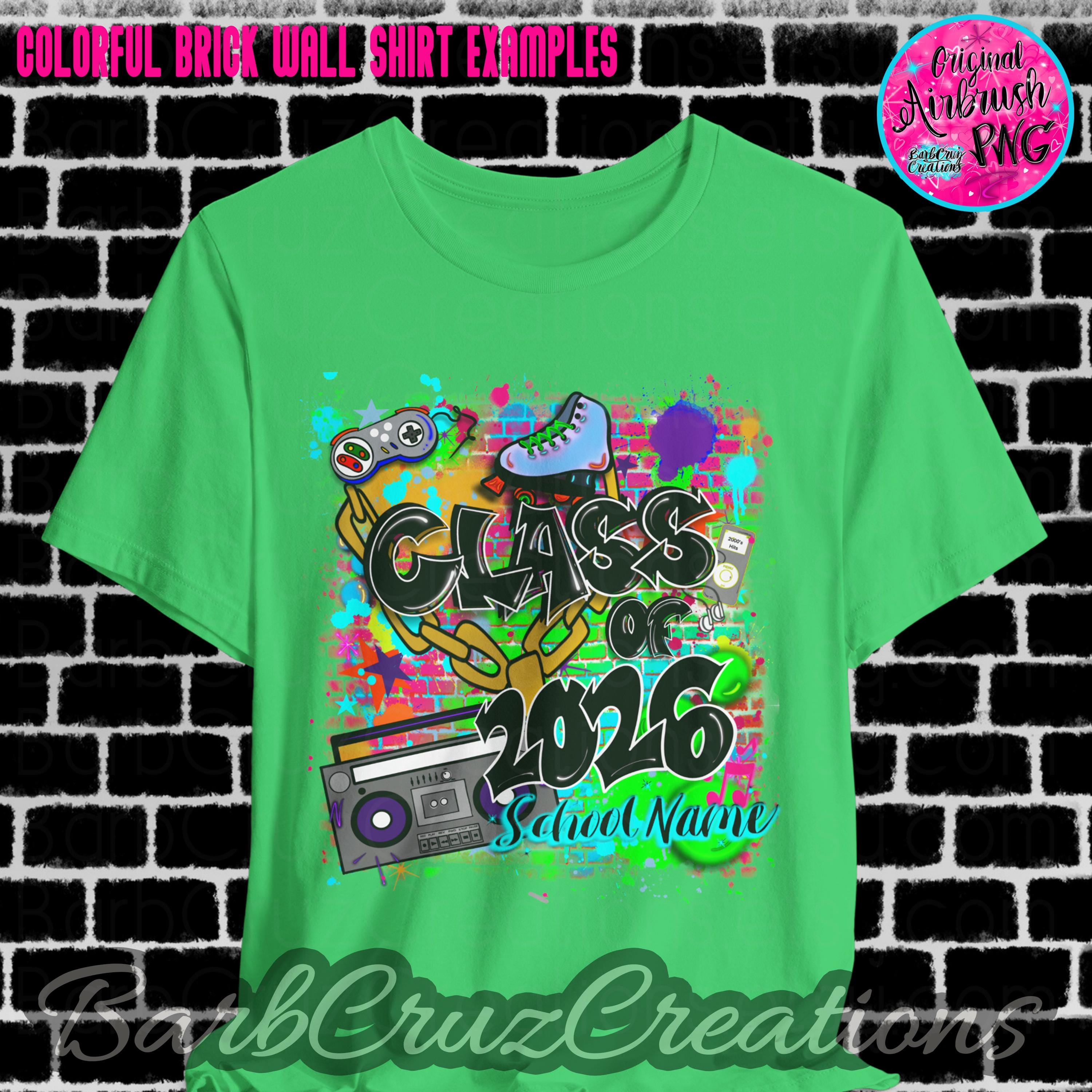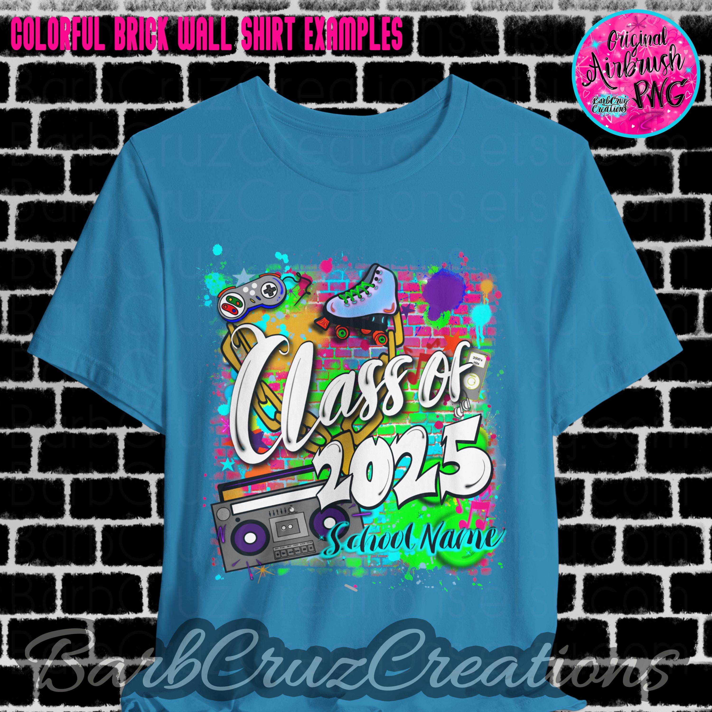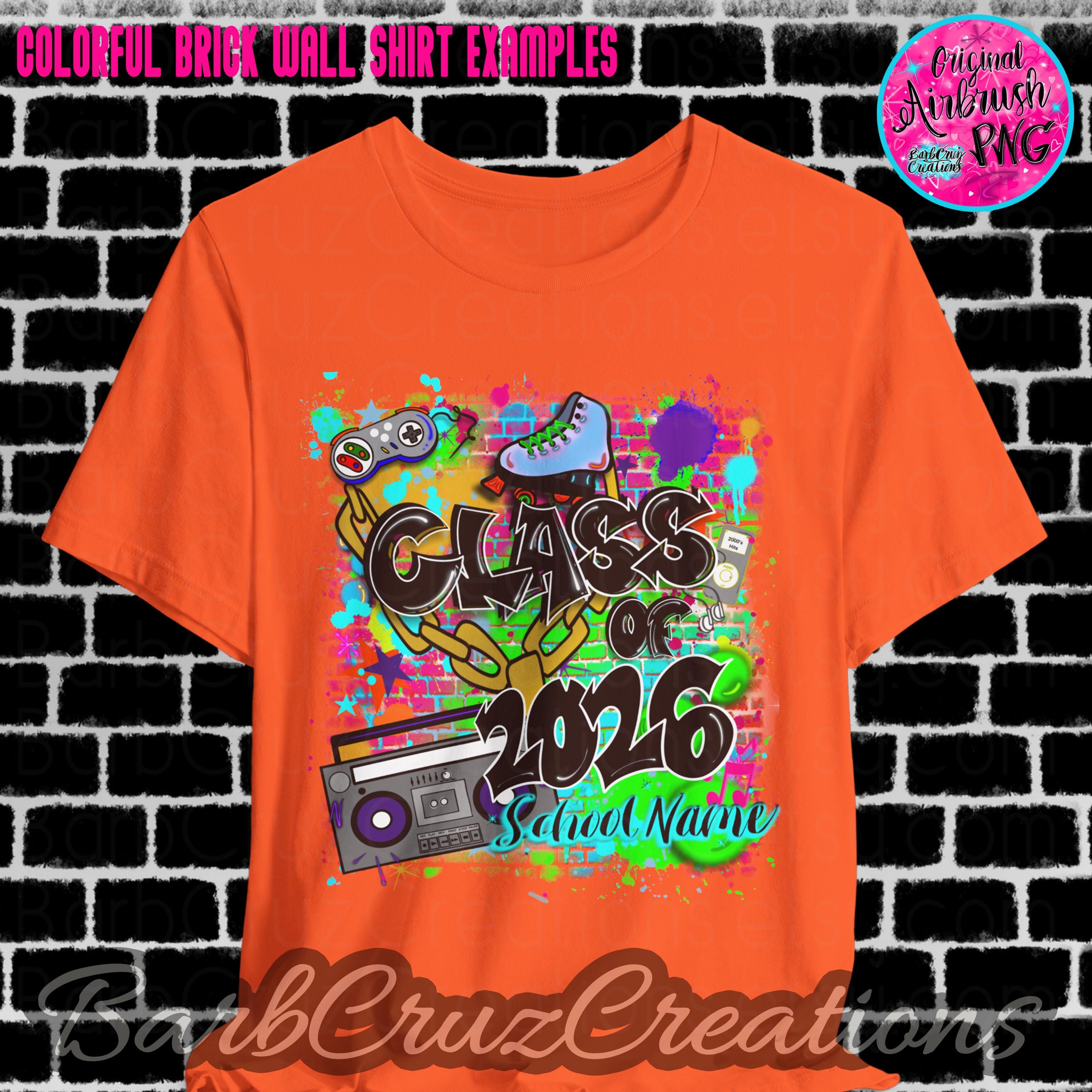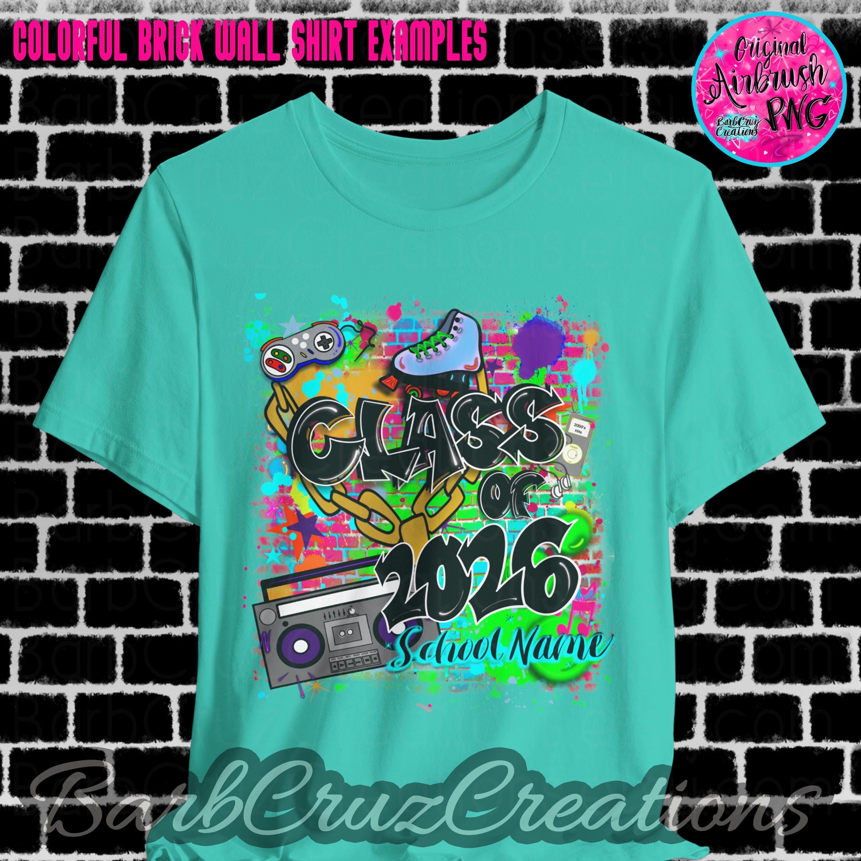This purchase is for a colorful 90's/2000's airbrushed brick wall design with your choice of black or white wording, your school name OR student name, and the graduating year added.